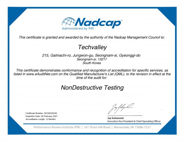 테크밸리가 대한민국 최초로 NADCAP NDT DR 분야 인증 획득을 하였습니다.
