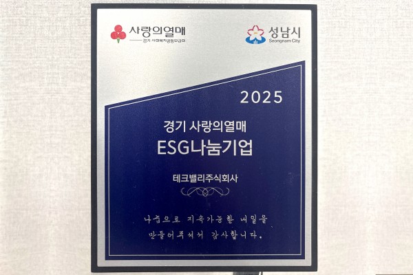 테크밸리가 지역사회 발전을 위해 기부를 실천한 기업에 수여하는 ESG 나눔기업으로 인증받았습니다.