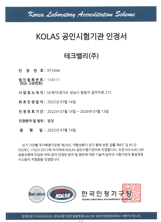 테크밸리는 국내에서 최초로, 유일하게 X-Ray CT 영상분야의 KOLAS 공인시험기관으로 인정되었습니다